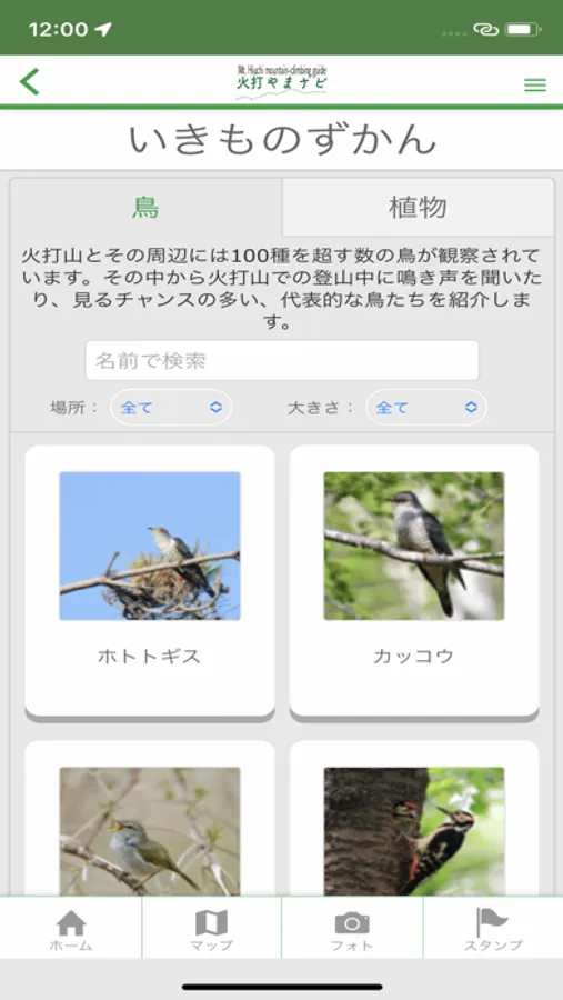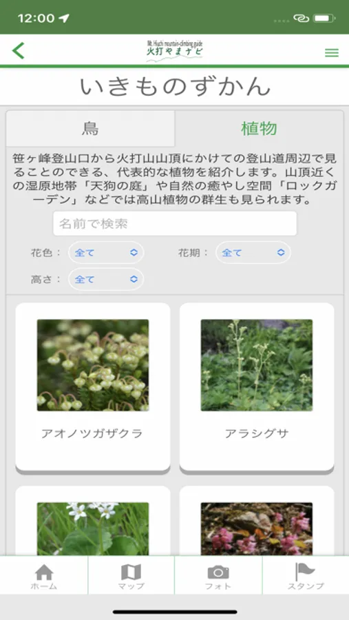 火打山登山道で観察できる鳥類、植物を図鑑形式で検索できます。