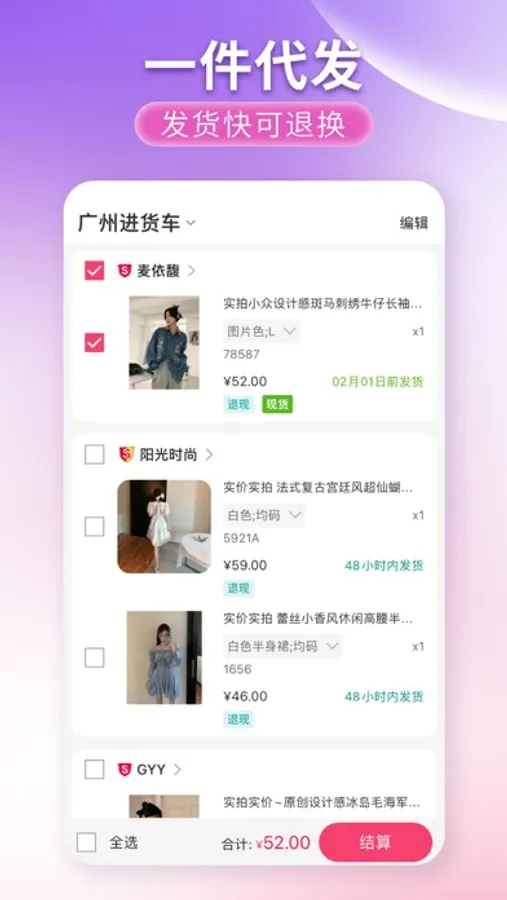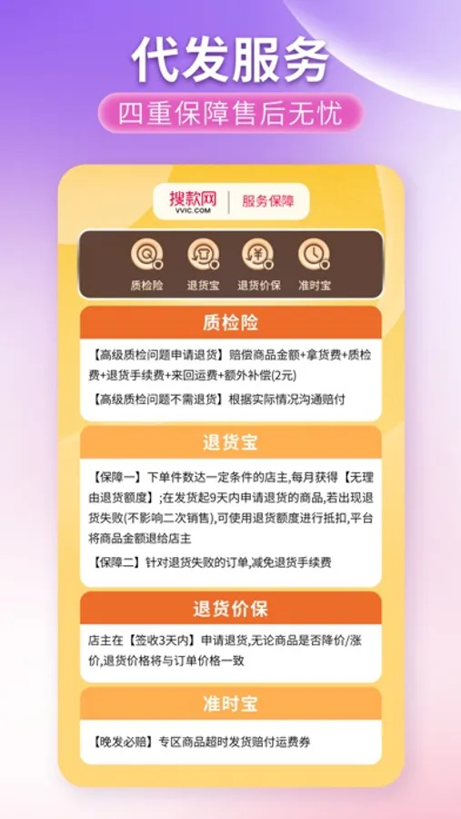 用搜款网进货,你只需要专心经营店铺,我们帮你跑市场拿货、质检、发货、退货。再也不用起早贪黑跑市场、不用到处拉人拼货。