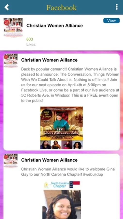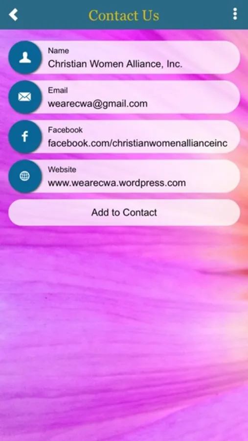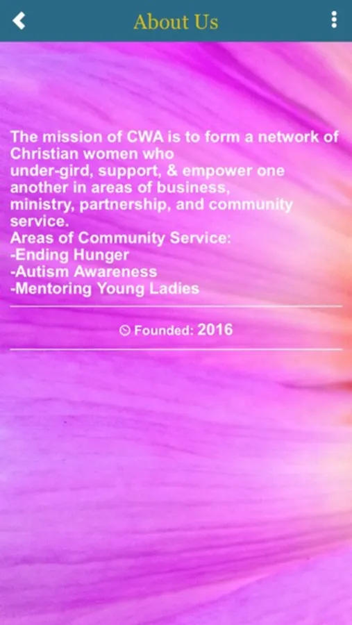 This App will connect you with our organization, Christian Women Alliance. The mission of CWA is to form a network of Christian women who under-gird, support, & empower one another in areas of business, ministry, partnership, and community service.