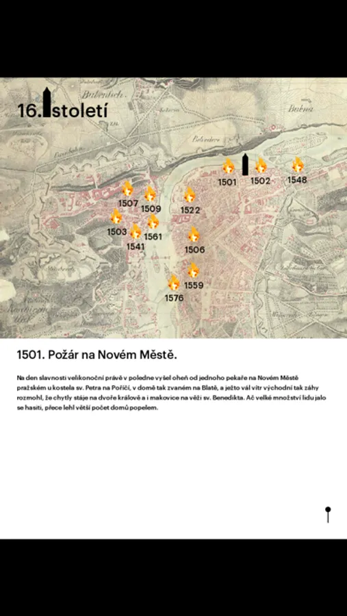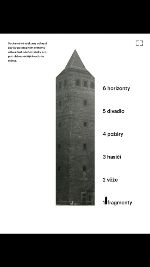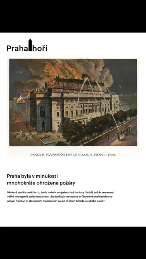 Tato multimediální aplikace představuje atraktivním a zábavným způsobem expozici s tématikou odvěkého ohrožení Prahy ohněm, způsoby hašení a organizování hasičů v dobách minulých. Požáry od 12. do 20. století jsou přiblíženy pomocí dobových popisů, hojně i vyobrazení – zajímavé požáry 19. století zobrazují zejména grafické listy zachycující řadu detailů. Výpovědní hodnota dobových obrazových materiálů je umocněna jejich rozpohybováním pomocí animací zachycených dějů, čímž statická vyobrazení dostávají pozoruhodný dynamickou podobu. Expozice je umístěna ve vodárenské věži ze 17. století, technické stavby, která je součástí skupiny kamenných věží v historické Praze o jejichž zpřístupňování se stará Muzeum hlavního města Prahy. Tato věž je pro veřejnost otevřena poprvé a návštěvníkům nabízí multižánrovou expozici Praha hoří s významným využitím nových médii, ale i neobvyklý výhled na Prahu z vyhlídkového prostoru na vrcholu věže, který plnil funkci exkluzivní rozhledny již v 17. století.