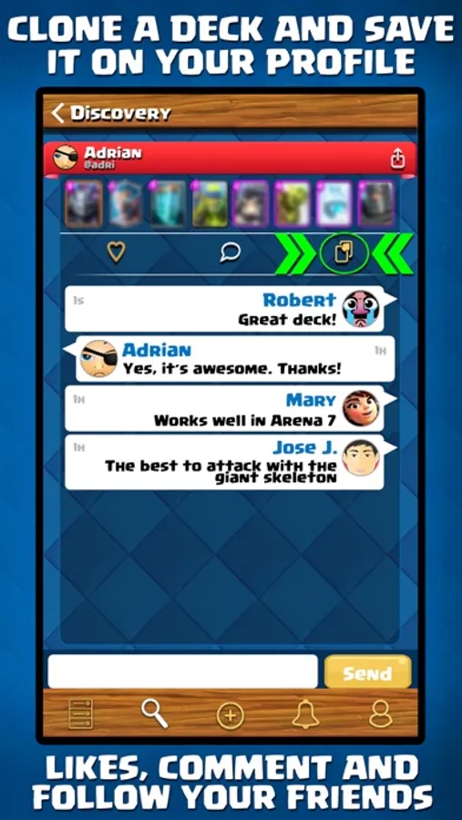 - Profile: you will have your profile page where you can customize your avatar, see your followers, the people you follow, your trophies, see the decks you like and much more ...