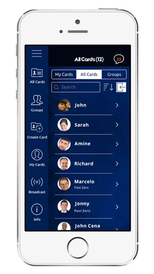 Going to a networking event? Set your app to share your e-Card with the Group as soon as you arrive. Did you miss talking to a person that you saw across the room earlier because the insurance salesman had you cornered at the bar? No problem! Contact them later at your convenience using the attendees list downloaded to your phone.