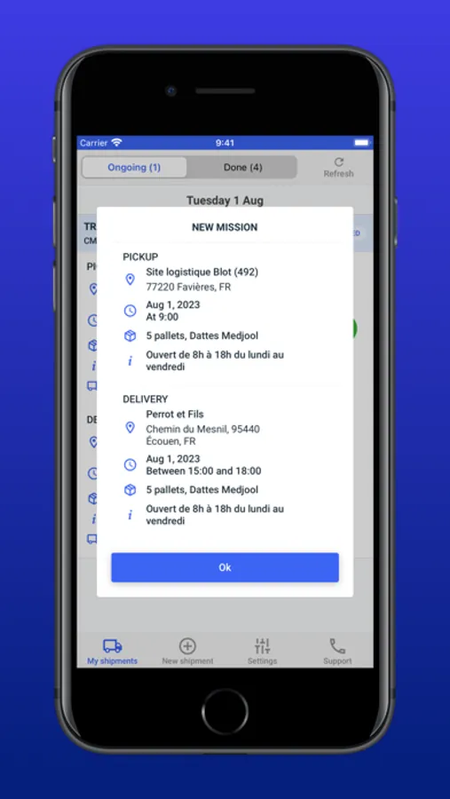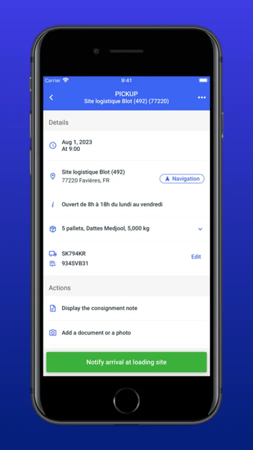 - Share information in real-time with all your contacts (transport status, departure and arrival times on site, etc.);