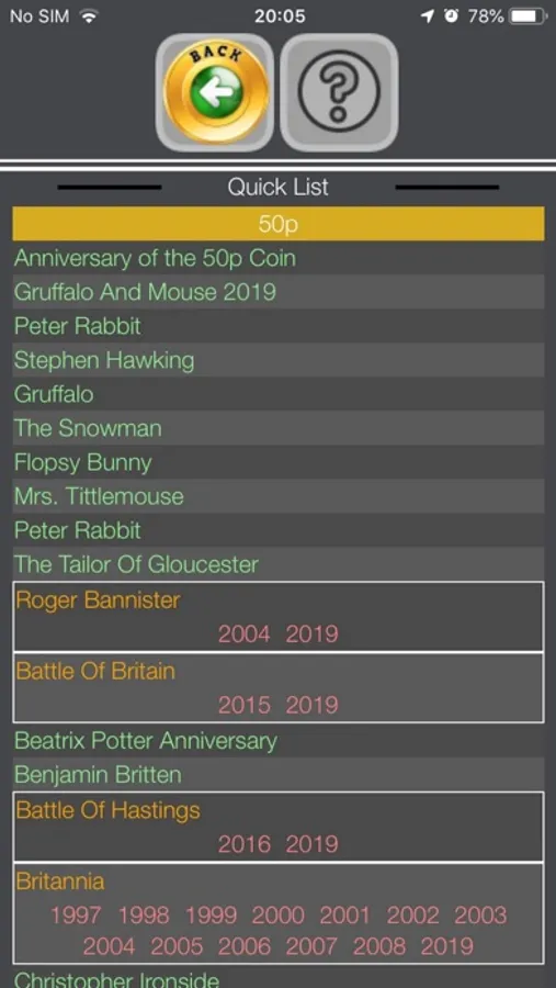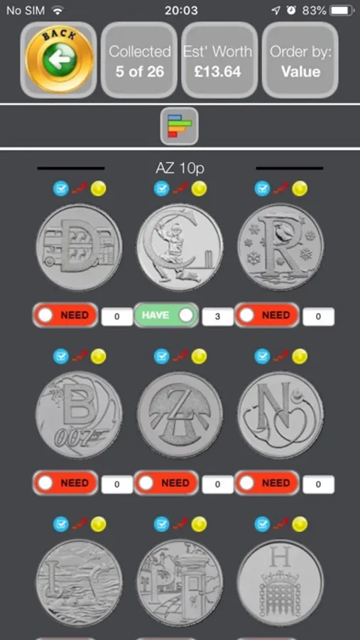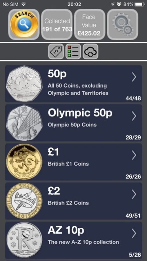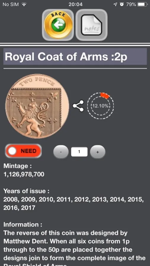 This application assists UK coin collectors by keeping a checklist and quantity of over 920 coins, including 1p, 2p, 5p, 10p, 20p 50p, £1, and £2 coins.