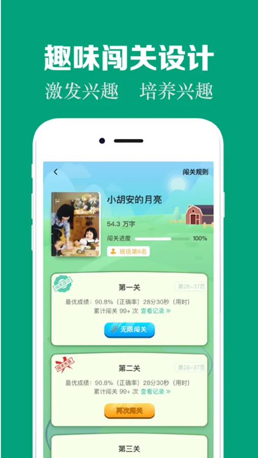 闯关游戏式的阅读测试能够提升孩子的阅读兴趣,每一次闯关成功都让孩子更有成就感。 【培养自主自信】