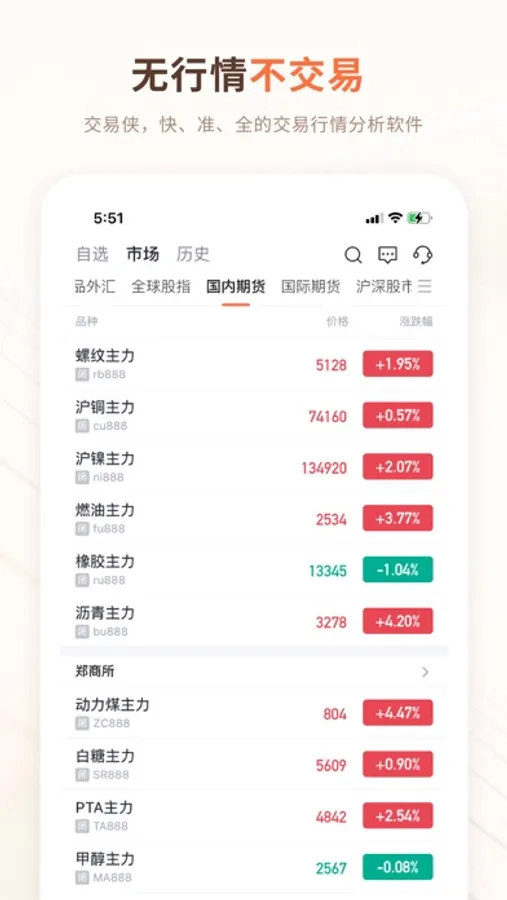 2、报价墙:覆盖最全品种的毫秒级实时报价,并可根据关注度对个人品种排序;