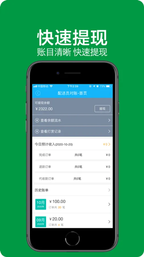 是一款具有抢单,取货,配送,以及配送记录的一款专用配送人员打造的APP,支持新订单语音提醒,路线导航等一系列使用功能,方便配送人员使用!