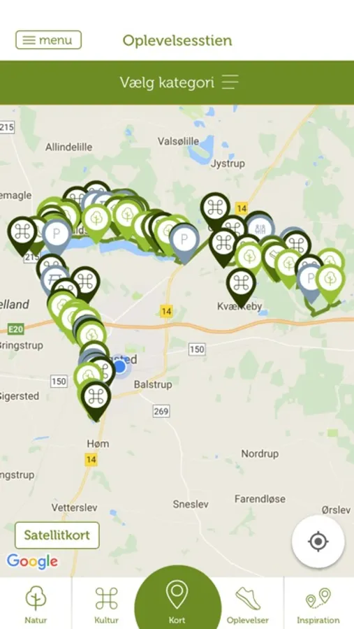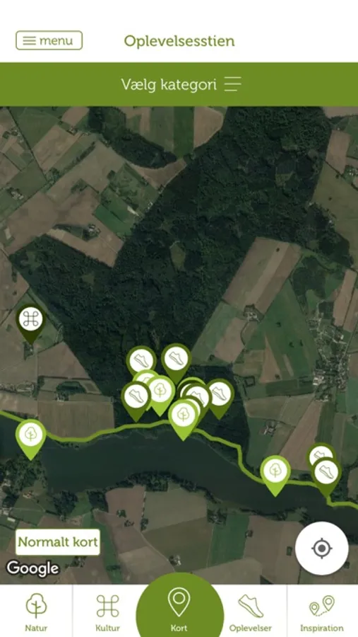 På det store kort kan du se rutens forløb. Og du kan let se, hvor der er aktiviteter, og hvor du kan parkere eller holde din næste picnic.