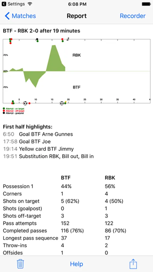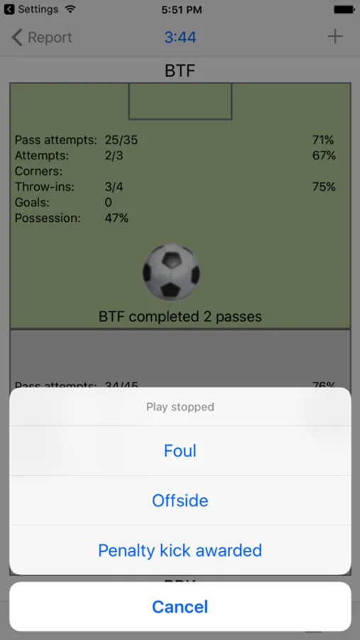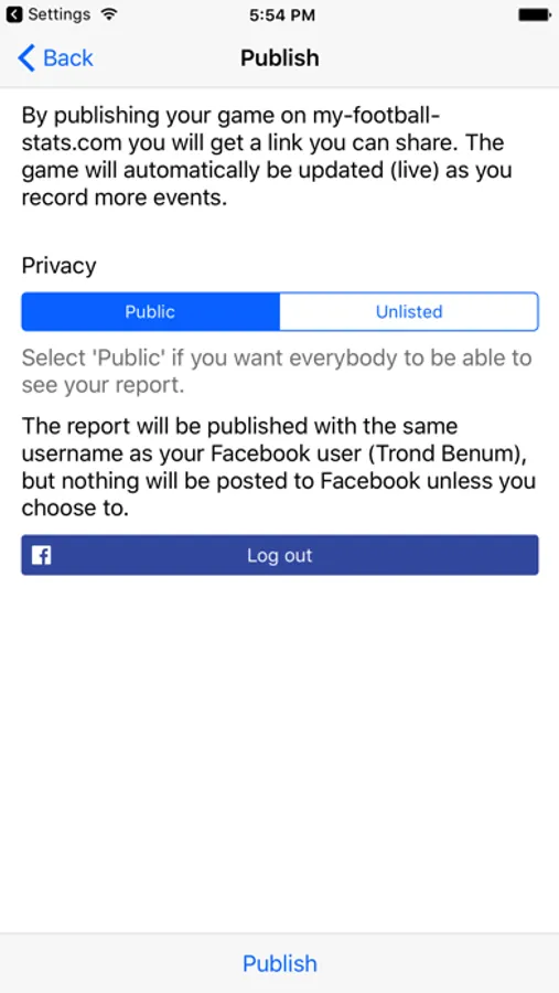 MyFootballStats lets you collect a rich set of statistics in a casual manner while watching a football game. It also lets you share the report live on my-football-stats.com. Other spectators can comment and add pictures from the game on the my-fotball-stats.com game page once you have started publishing. Visit https://my-football-stats.com to see a sample of matches which have been published.