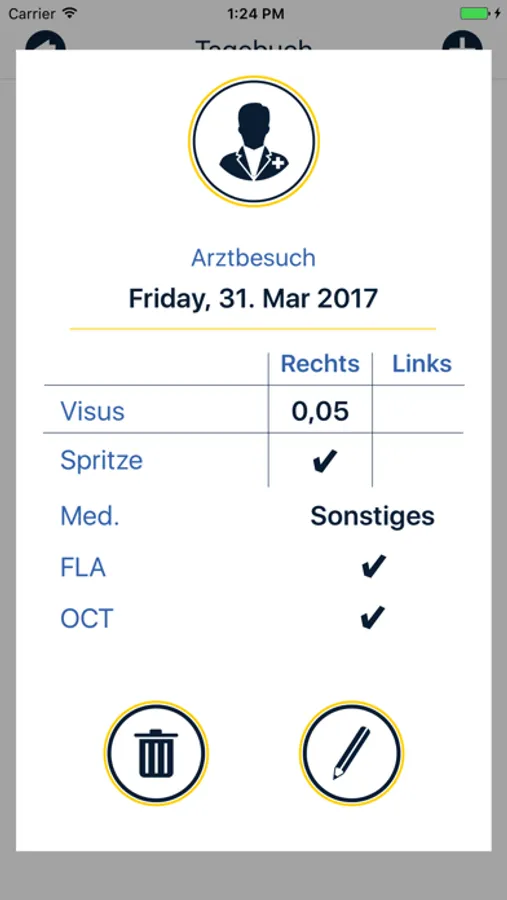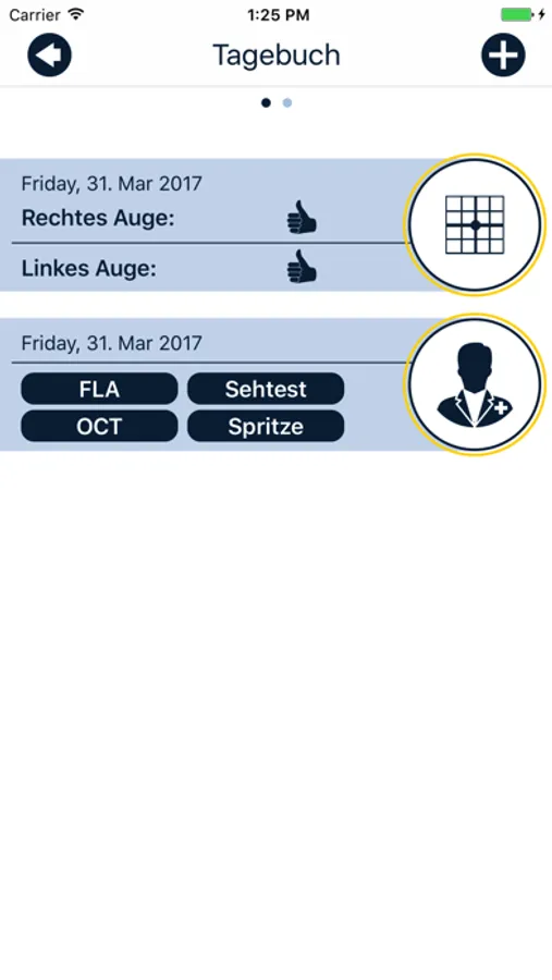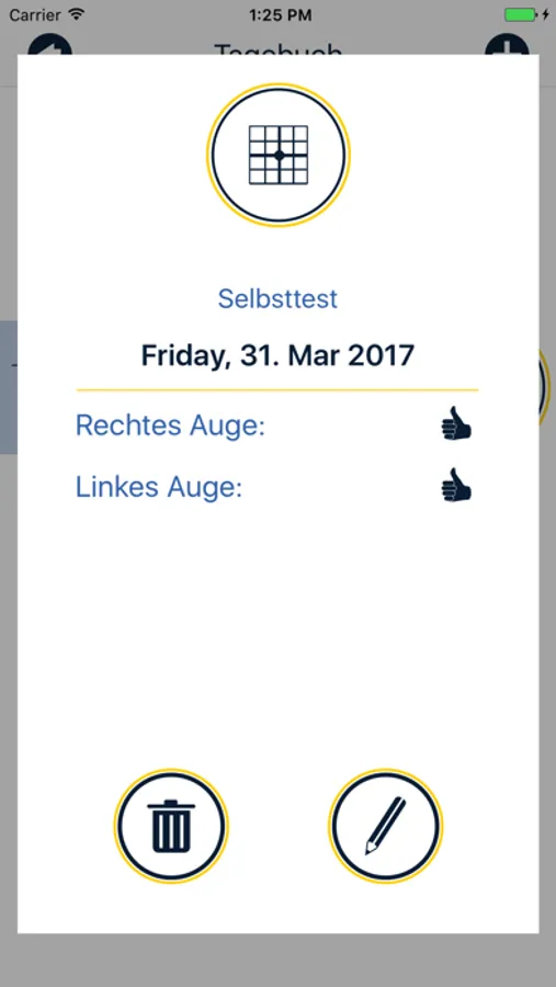 Im „AugenPass“-Tagebuch dokumentieren Sie ganz einfach Ihre Augenarztbesuche, halten Ihre Untersuchungsergebnisse fest oder können selbstständig Sehtests mit dem Amsler-Gitter durchführen. Zudem können Sie einen Bericht über den Verlauf der Erkrankung und durchgeführten (Injektions-) Therapie erstellen.