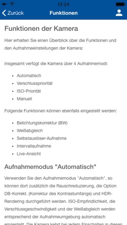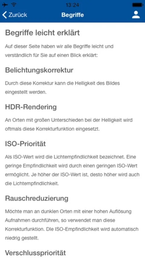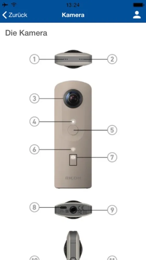 Des Weiteren sind in der App noch eine Anleitung, Begriffserklärungen und Funktionen der Kamera dargestellt. Auch eine Anleitung für das Stativ sowie Informationen zur Kamera und Kontaktdaten bei Rückfragen werden in dieser App aufgeführt.