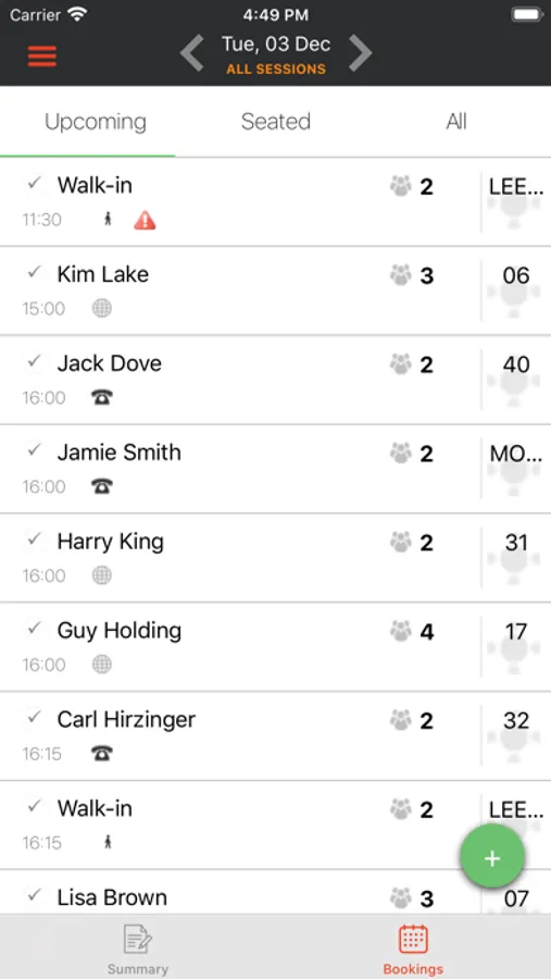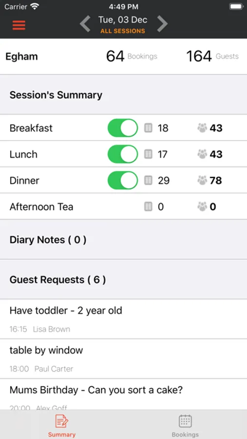 Summary tab gives quick access to your day that includes Guests notes, diary notes and booking summary.