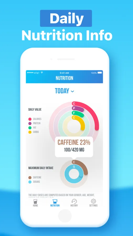 Water Reminder uses HealthKit in order to record drinking data to Nutrition section in Health application. The app requests access to the following data types: Water, Caffeine, Protein, Dietary Energy, Fat, Carbs and Sugars. When you add a drink to the app - it automatically sends to Health app the following nutritional information of that drink: water, caffeine, protein, calories, fat, carbs and sugars content. The synchronization with Apple Health can be switched off in the application Settings.