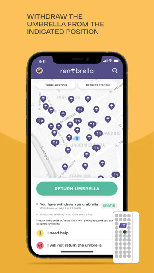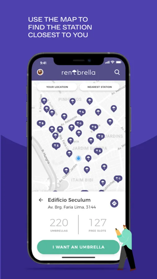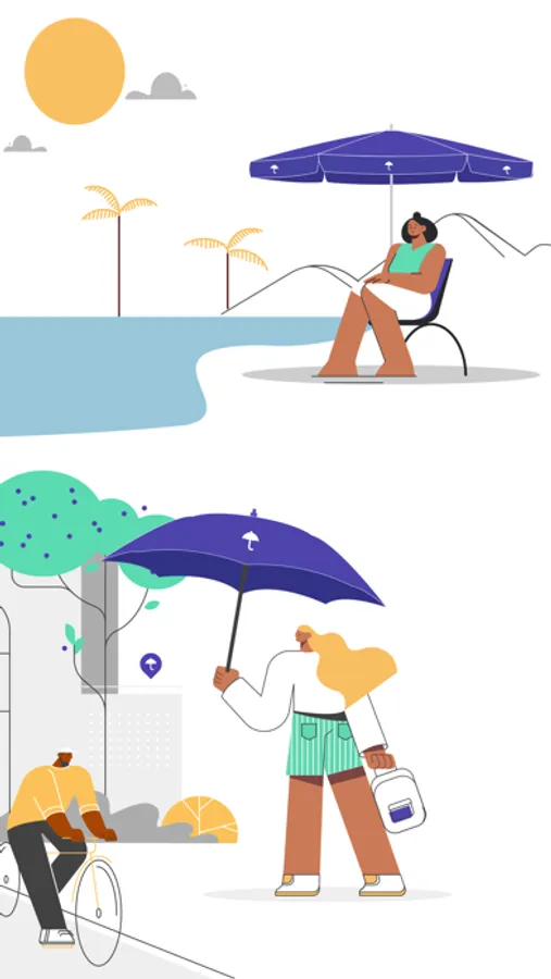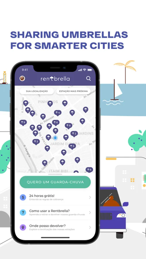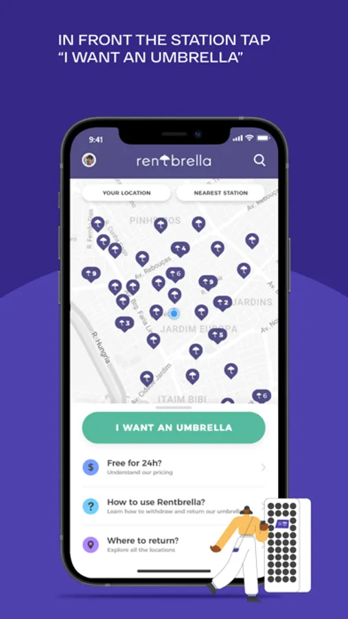 Rentbrella is here to make your life easier and keep the city always within your reach. Unexpected rains and UV rays can't be an obstacle in your days, not anymore. Next time the weather gets in your way, go to the nearest Rentbrella station and start sharing.