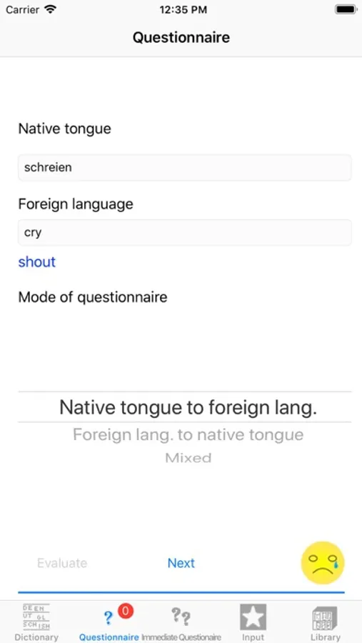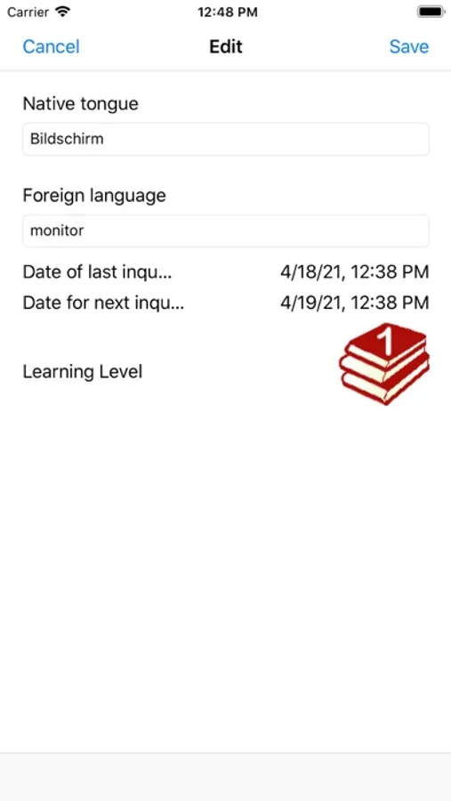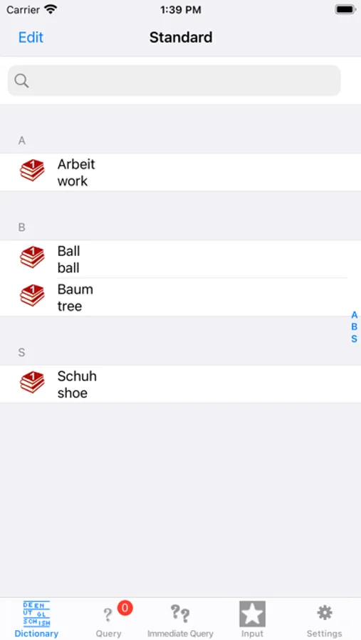 All vocabulary is shown in tab "dictionary", search function is included. Icons show the levels of all vocabulary. By clicking on a vocabulary additional information is shown and it could be edited.