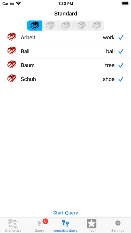 In tab "query" the vocabulary of activated dictionary which is actually to learn is queried.