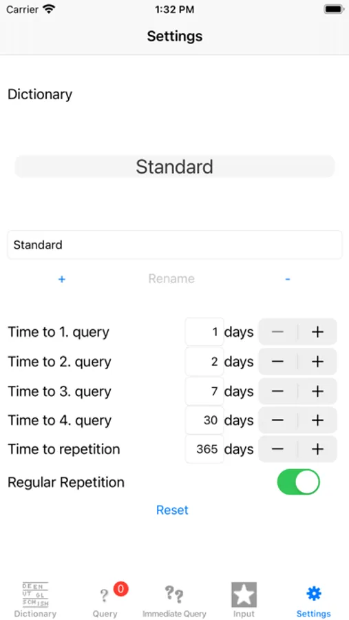 You could work with several dictionaries. Administration is done in the tab "settings". There you can select an already available dictionary, create a new or delete an existing one. All other tabs do work with the dictionary actually selected here. Additional the time distances between queries of different levels can be edited. They can be reseted to default values. The time distance of a level must be at least as long as the distance of previous level. In addition it is definable if vocabulary of level 5 should be repeated regularly.