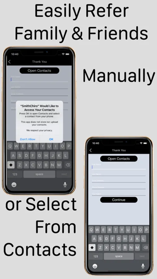 Smith Chiropractic Connect also allows patients to refer friends, family, or strangers. Information can be sent either way; the prospective patient's info to the doctor's office or vice-versa. Whatever is better for the person being referred is how the "digital introduction" can be made.