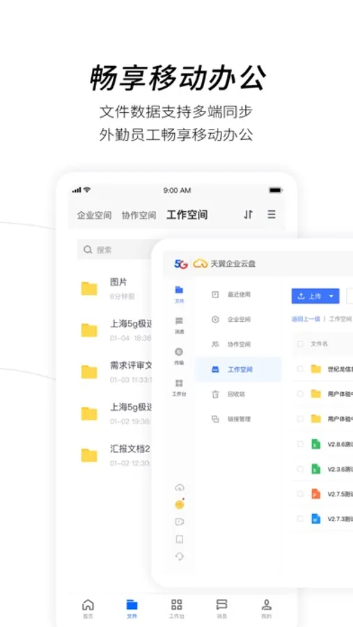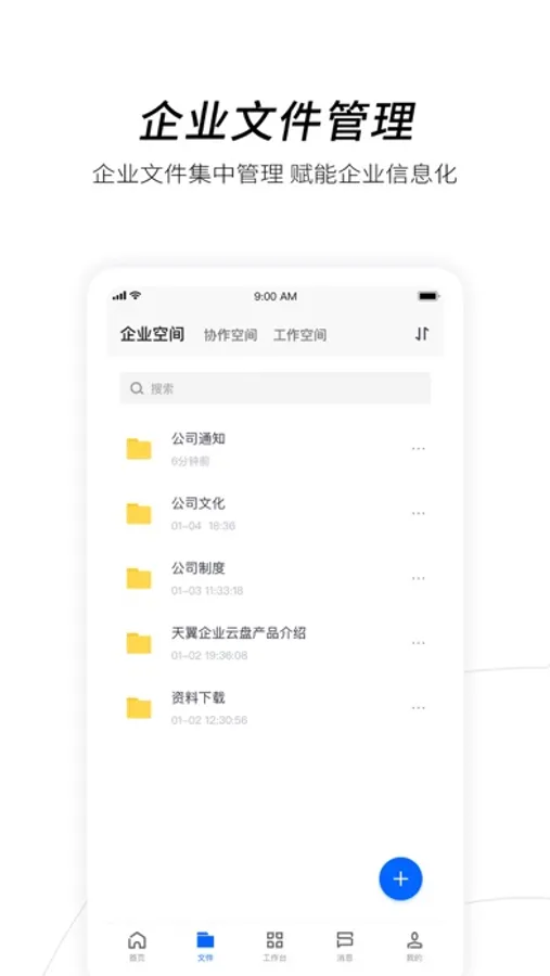文件极速传输、断点续传:电信宽带服务保障加上企业云不限速的特点,帮助企业实现文件极速传输;支持文件断点续传,省去传输中断的烦恼。