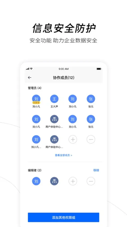 成员权限设置:为用户提供5种成员角色,可设置预览、上传、下载、编辑、管理等12种操作权限,保证文件安全前提下实现各种协作需求。