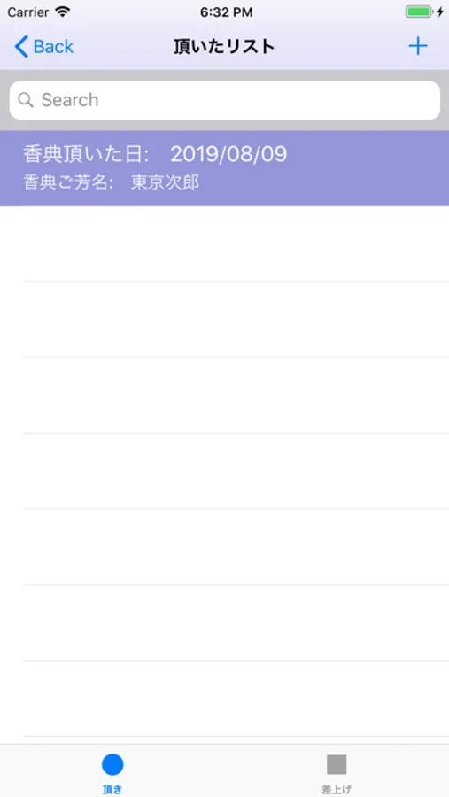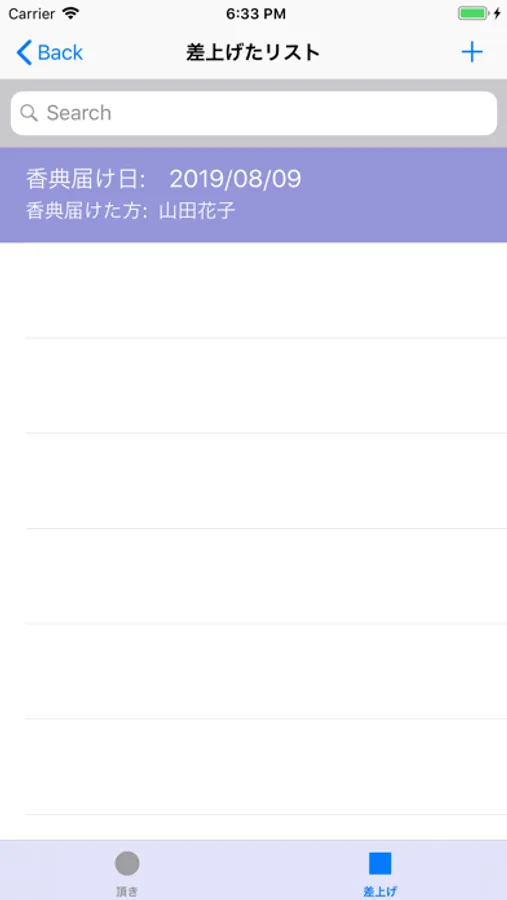 頂いた香典は、頂いた方の名前で検索でき、 香典をお出しした場合は、お届けさの方の名前で検索できます。