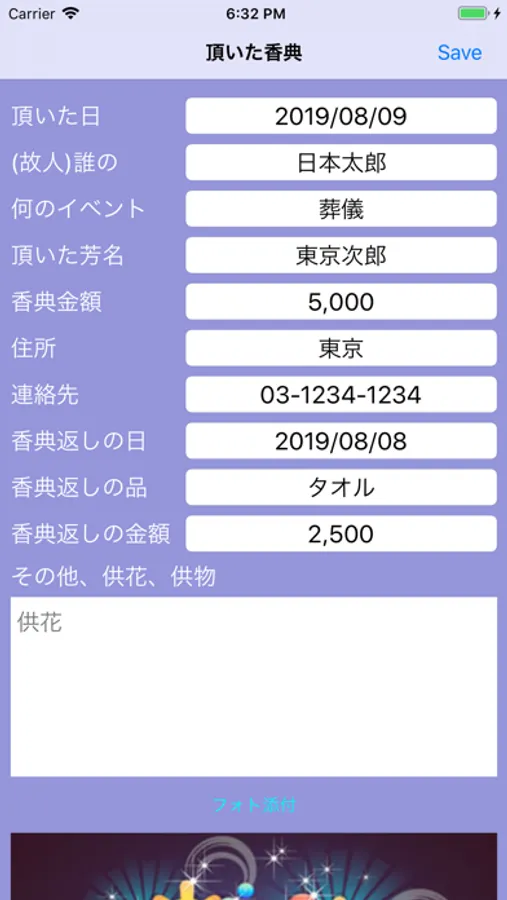 頂いた香典、その香典返し、 また、別の方に香典をお出しした場合に記録管理できます。