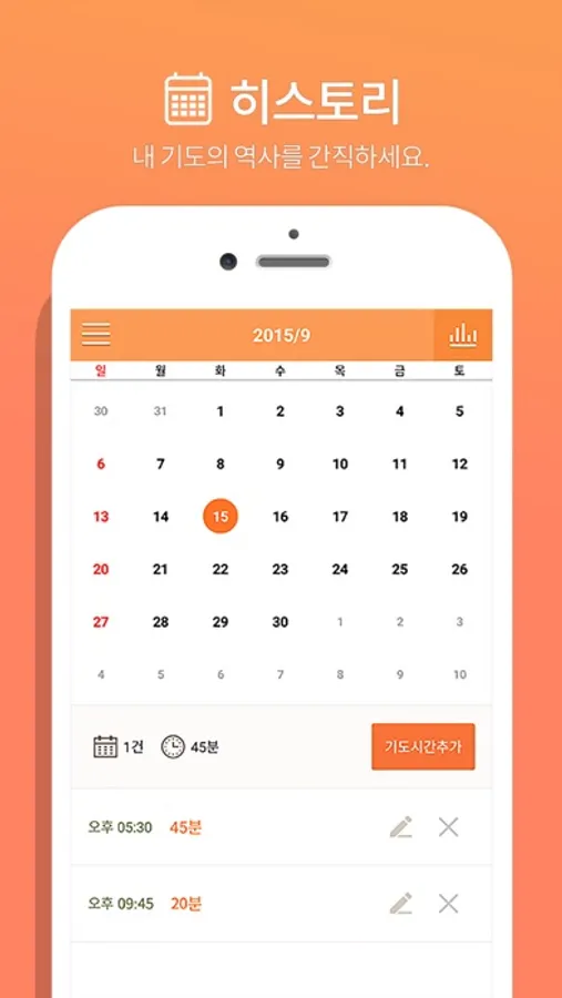 - 기도 달력에서 나의 기도역사를 한눈에 확인할 수 있습니다.