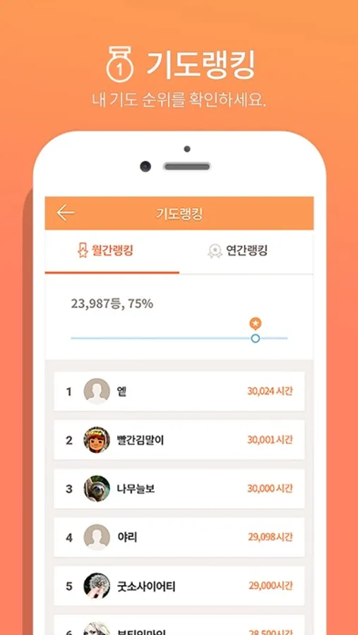 - 모든 회원들 가운데 내 기도순위를 확인할 수 있습니다.