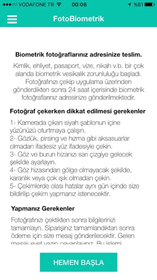 Zaman kaybetmeden, uygulamamız üzerinden fotoğraflarınızı çekip bize gönderin. 24 saat içinde resimleriniz biometrik standartlara uygun halde yapılıp adresinize postaya verelim.