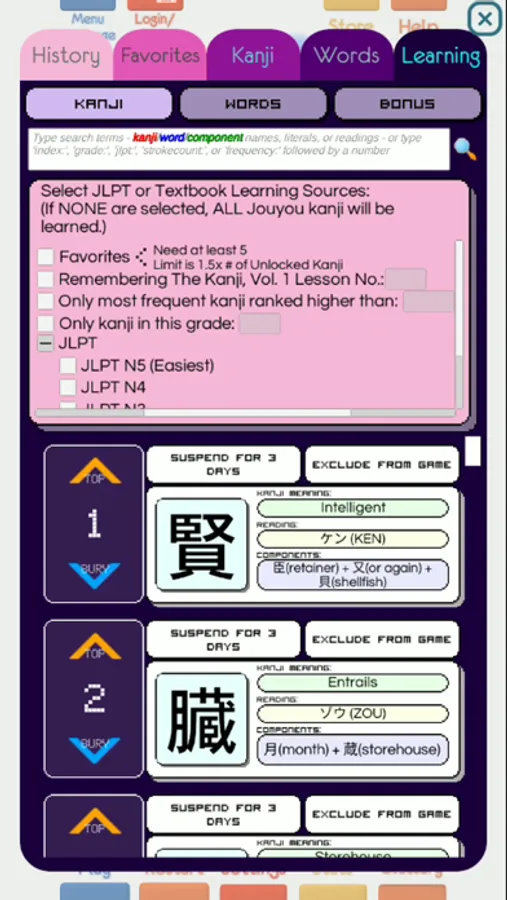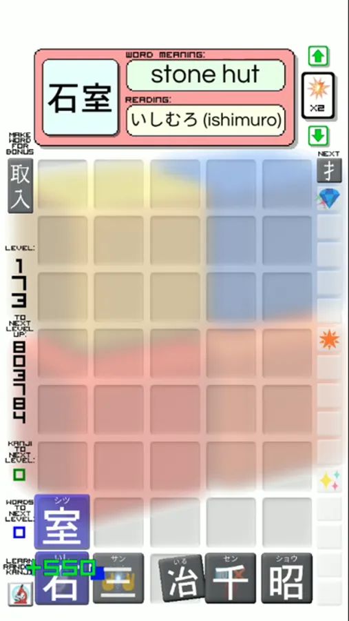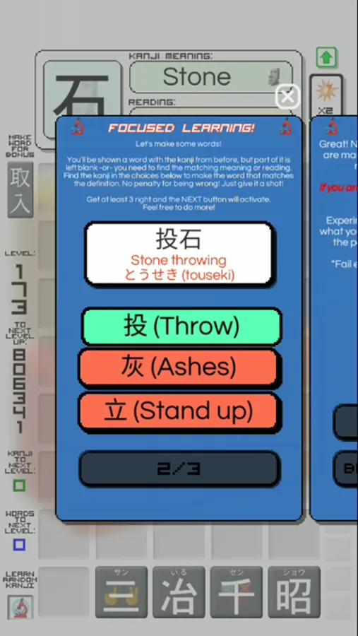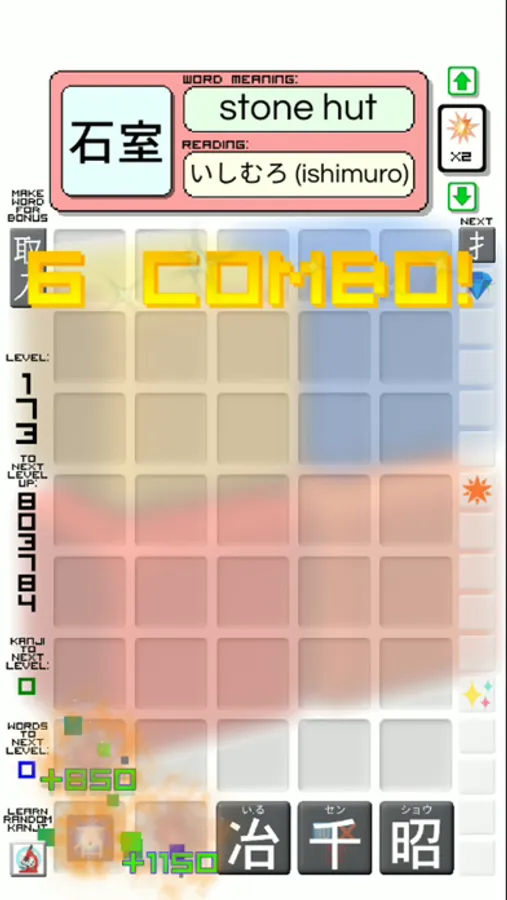 Learn Japanese kanji by dropping blocks to make kanji and words! Make kanji from their parts and words from other kanji! Blow them up by making words! Fill your limit meter by making kanji from others and watch your blocks blow up!