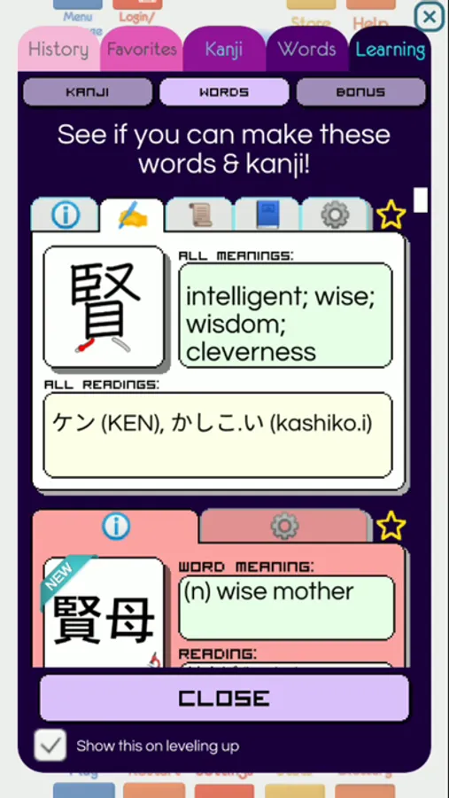 Open to all skill levels! It starts off easy and gives you hints when you're stuck. Keep playing and you'll find yourself recognizing more and more kanji! You can select Easy/Learning mode to have more time to read about the kanji and words you make!