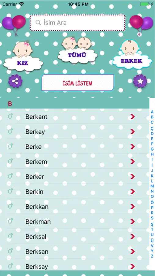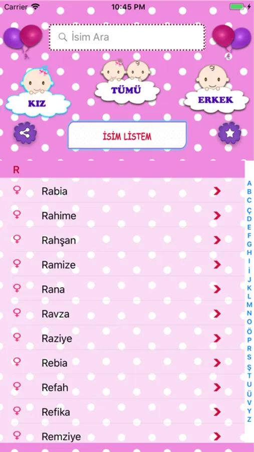 İsimleri cinsiyete göre seçim yaparak alfabetik olarak listeleyebilir ve sevdiğiniz ismin anlamını öğrenebilirsiniz.