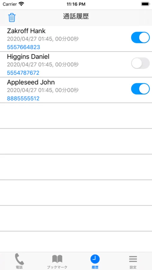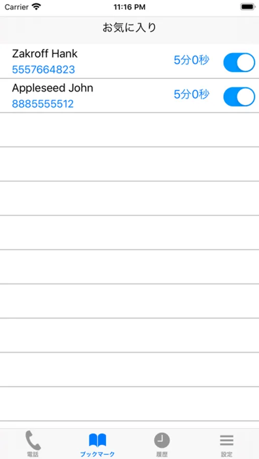 ブックマークした番号をタップしたら、発信する。(履歴から番号のスイッチをONしたら、ブックマークできる)