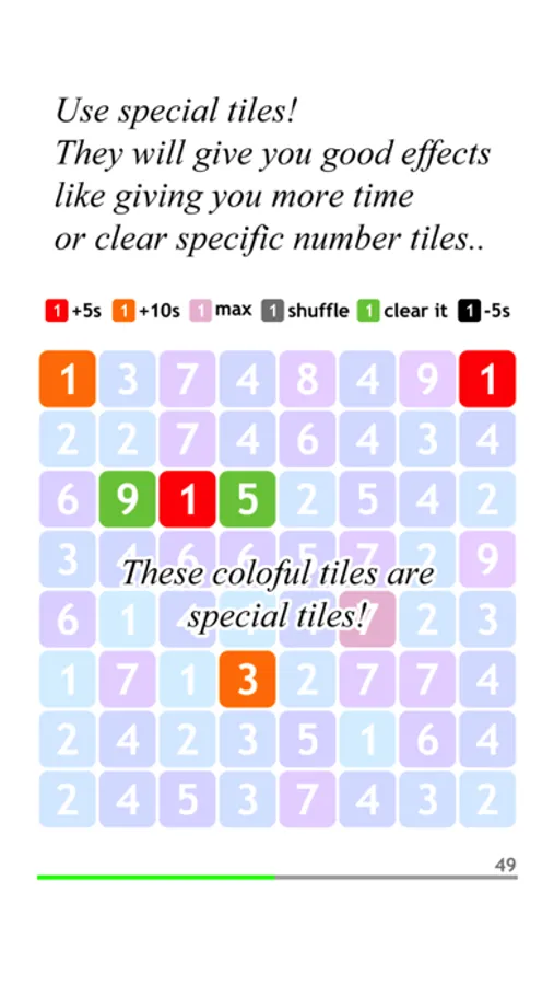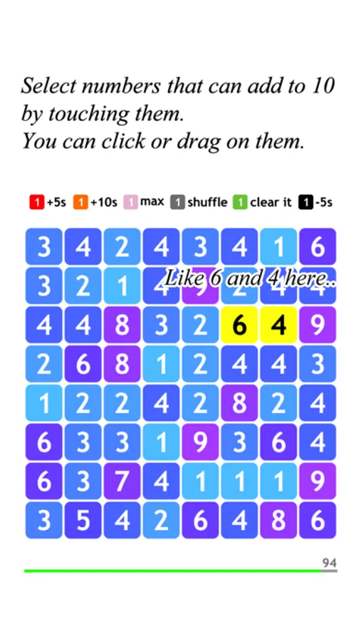 Find numbers that can make 10, like 4 + 6, 2 + 8, or 1 + 2 + 3 + 4, then POP go the numbers. The goal is to pop as many number tiles as possible in the limited time. The faster you think, the higher score you'll get.