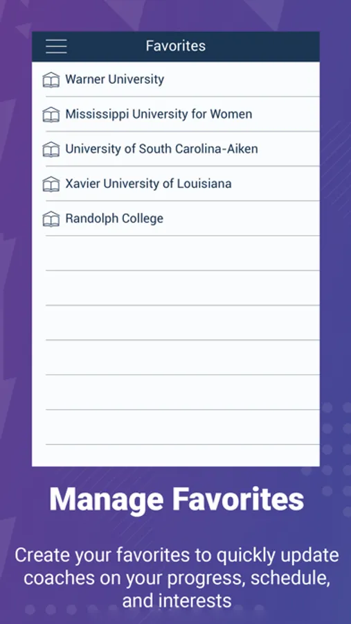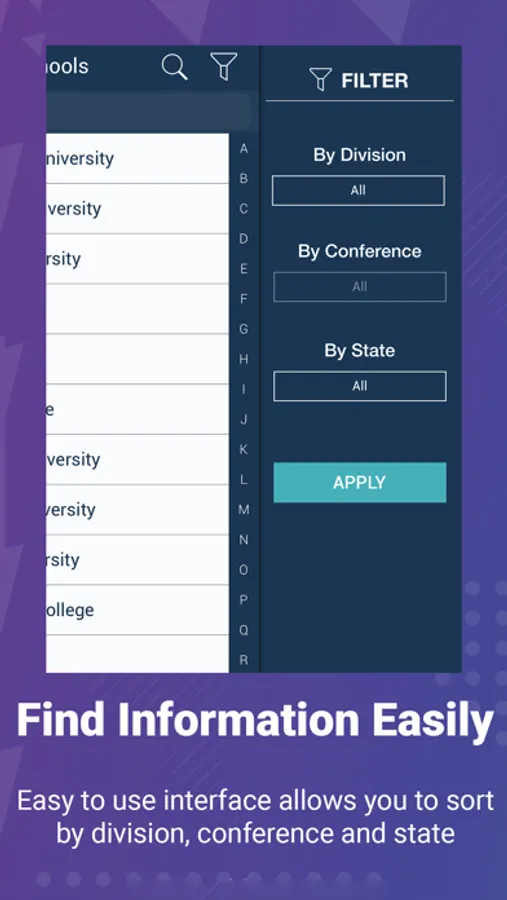 * Easy to use interface to sort and views schools by state, division, conference, or name.