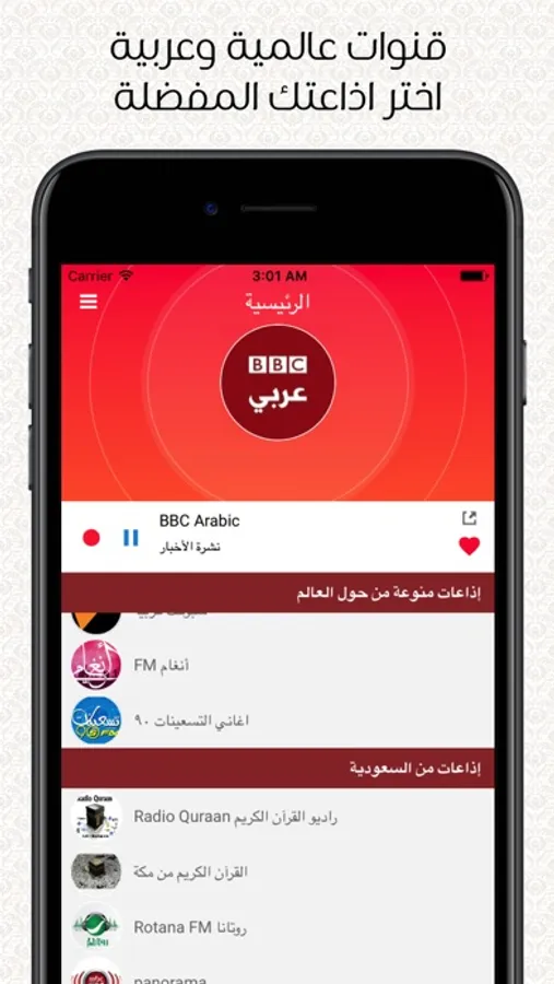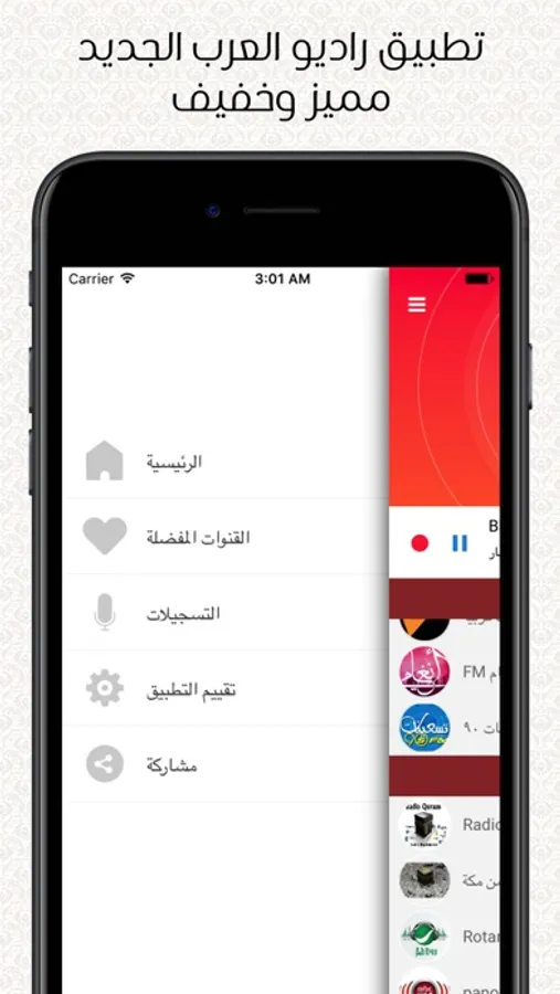 تطبيق راديو العرب المطور، تطبيق اذاعي مميز وخفيف، قنوات عالمية وعربية، بامكانك تسجيل البث وسماعه لاحقا.