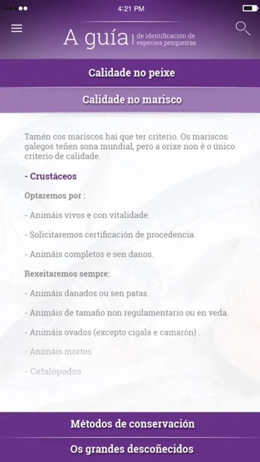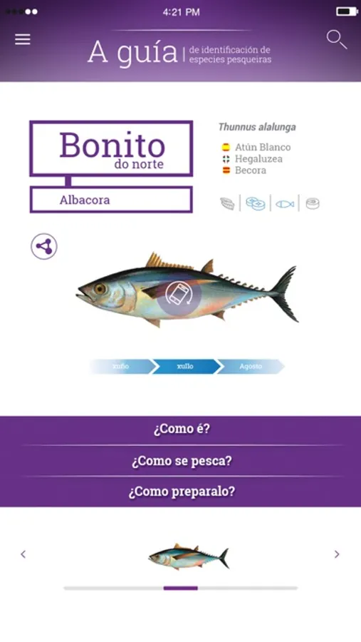 [GL] A guía de identificación de especies pesqueiras é a aplicación oficial da Xunta de Galicia para a consulta da información das distintas especies pesqueiras que habitan as costas Galegas.