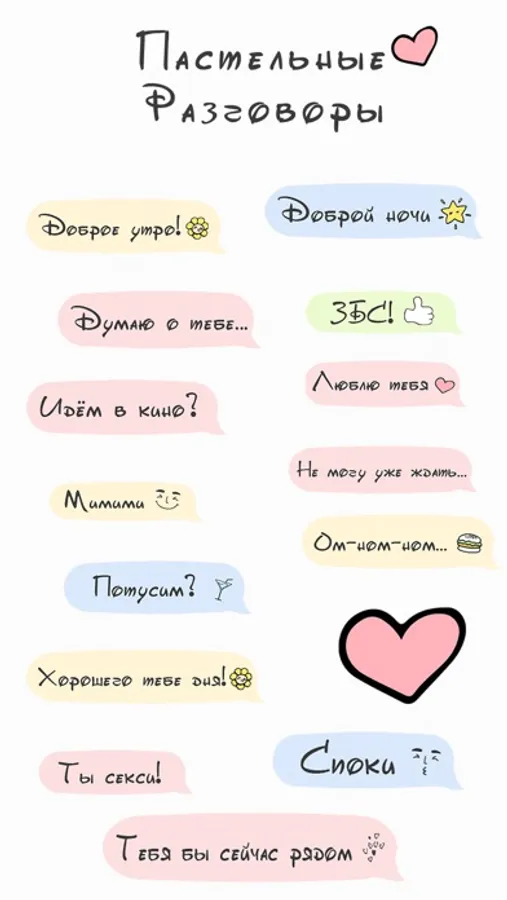 Вот Вам милые цветные стикеры в пастельных тонах! Набор включает в себя 63 фразы и 9 милых смайликов. 63 фразы являются наиболее часто используемыми в повседневной жизни. Вы можете использовать эти стикеры каждый день и в любой особенный момент!