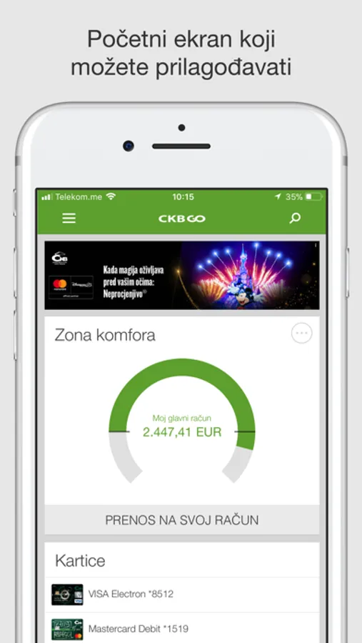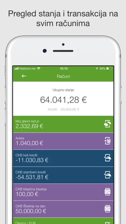 • Pregled stanja i transakcija na svim računima, karticama, kreditima i štednji kod CKB-a