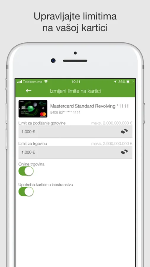 • Kompletno upravljanje svim karticama, jednostavna primjena limita na bankomatu, limita za trgovinu u zemlji i inostranstvu, promjena statusa kartice, ApplePay In-App Provisioning