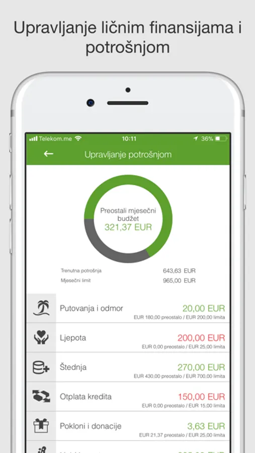 • Upravljanje ličnim finansijama i potrošnjom, određivanje ciljeva za štednju, kategorizovanje i podešavanje mjesečnog limita svih vrsta transakcija (otplata kredita, pokloni i donacije, hobi i sport, domaćinstvo, računi, putovanja, edukacija, garderoba, itd)