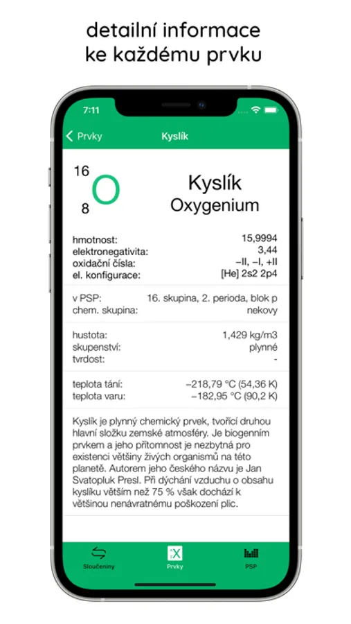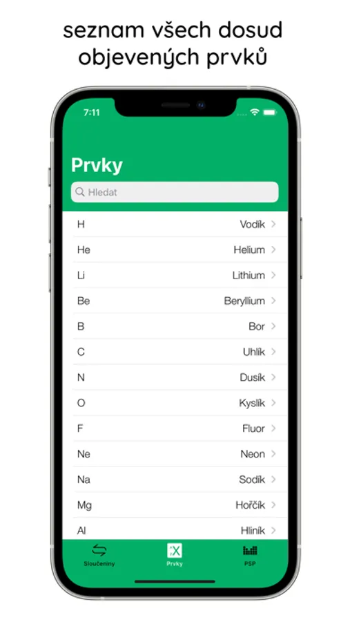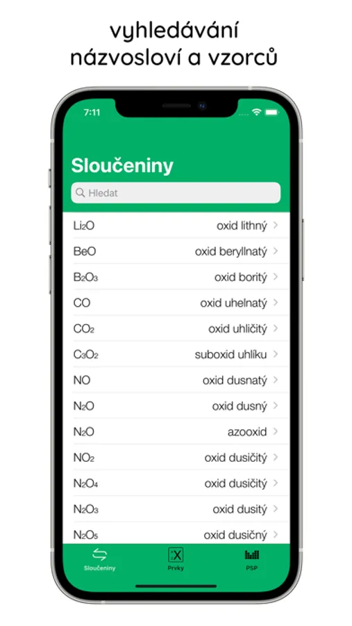 Chemie je důležitá, ale složitá věda. S touto aplikací pro vás však bude hračka a v názvosloví se už neztratíte. Aplikace obsahuje databázi obsahující 3882 nejpoužívanějších sloučenin a všechny známé prvky. V aplikaci lze snadno a rychle vyhledávat sloučeniny i prvky, a to jak z českého názvu na prvek, tak ze vzorce zpět na český název. U každého prvku jsou uvedeny detailní informace, přesné hodnoty a stručný popis. Aplikace obsahuje periodickou soustavu prvků.