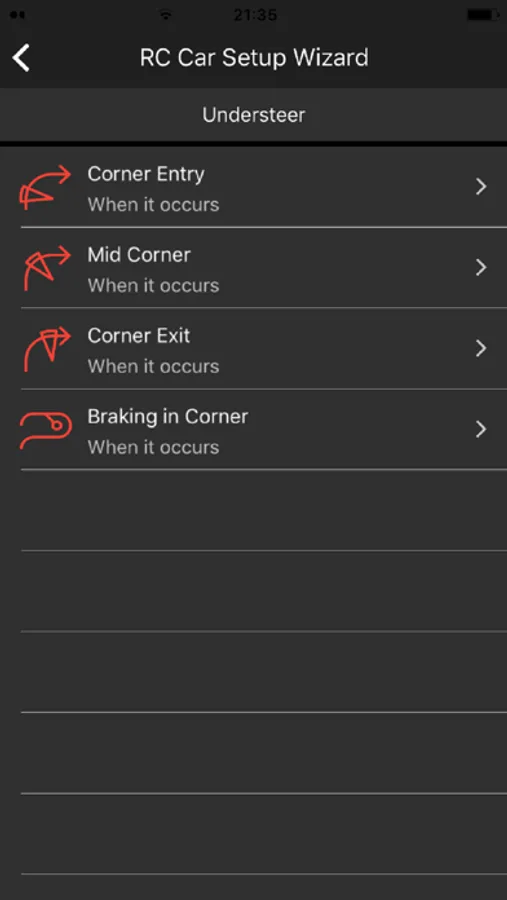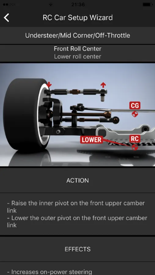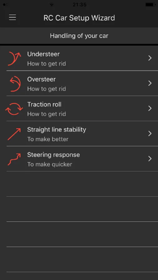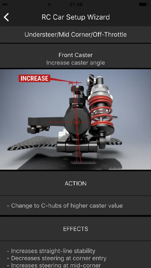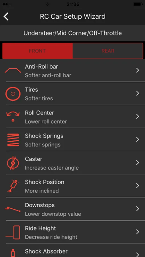 - App takes you through the analysis of the driving characteristics of the vehicle to setup the various parts.