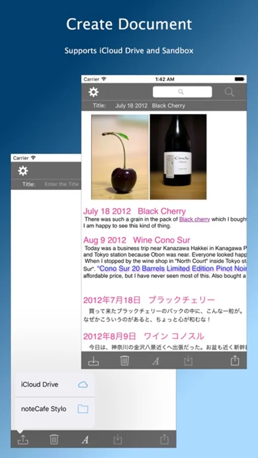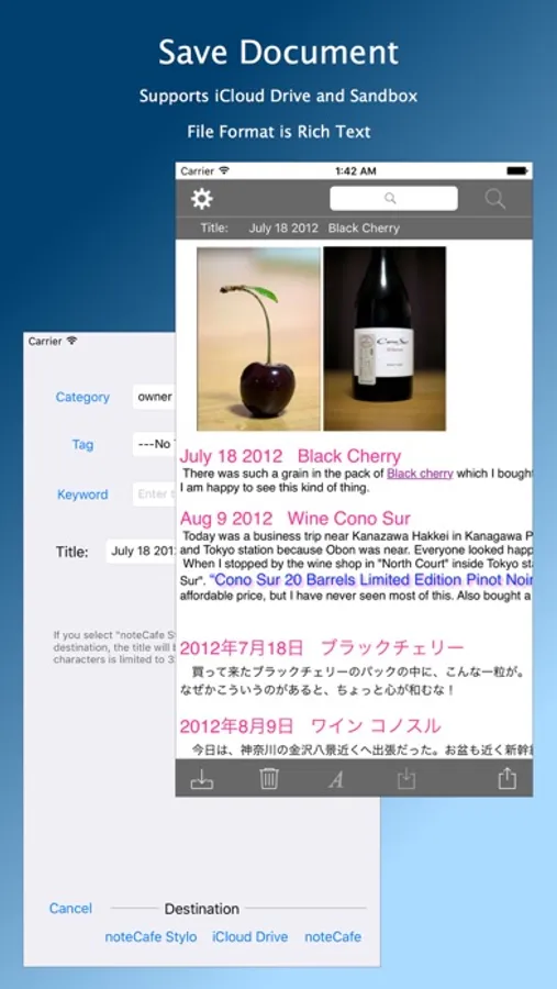 "noteCafe Stylo" is saved in rich text (RTFD). It supports iCloud Drive. "noteCafe Stylo" can also be saved in the sandbox.