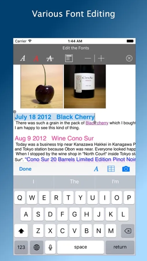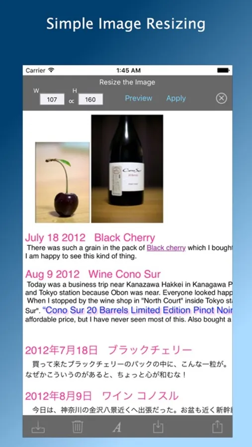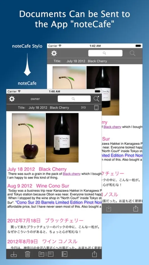 “noteCafe Stylo” is a text editor that can be edited with rich text (RTFD). Font, font color, font style and font size can be easily changed. Headlines can be also set easily. Images and files can also be attached. Images can be resized while checking with preview.
