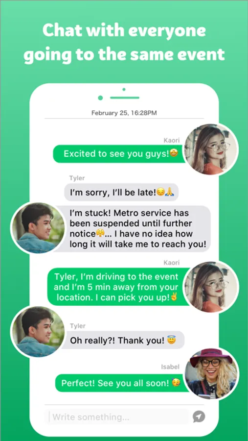How does Ikou work? Easily create an event, choose the location, invite your friends, and let them know when you're on your way. Share your mode of transportation with the group and Ikou will temporarily show your location and estimated time of arrival to the event. Ikou automatically detects when you have arrived and notifies your friends. Your geo-location sharing expires once you have reached your destination.