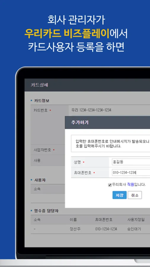 * “우리카드 법인 비즈플레이” 모바일앱의 카드등록은 회사 관리자가 “우리카드 법인 비즈플레이” 웹사이트의 “법인카드관리”에서 카드 사용자 등록을 해야 합니다.
