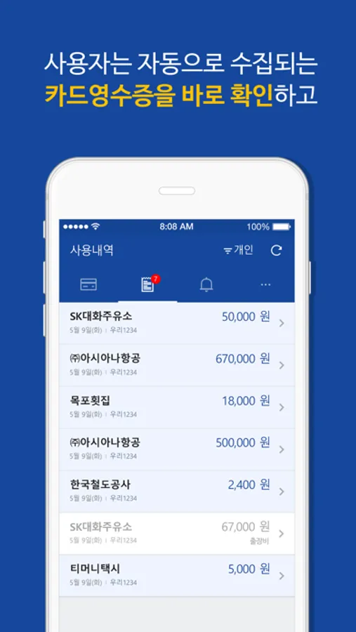 * 자동 수집된 카드영수증은 “우리카드 법인 비즈플레이” 모바일앱 또는 PC에서 사용자가 간편하게 경비처리 할 수 있고, 회사관리자는 PC에서 법인카드 사용내역을 한눈에 보고, 경비지출관리가 가능합니다.