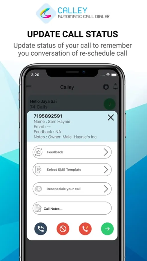 Upload the lists of users you want to call on your account on GetCalley and sync it on the Calley app on your mobile phone. Now all you need to do is click on "Start Calling" and the app will start making automatic calls to the desired numbers. You can update notes after each call or even reschedule call to be made at the end of the list.