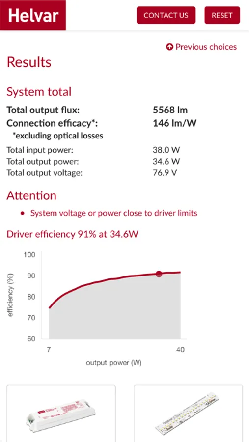 LEDesign shows the key electrical and photometrical parameters for the selected combination. It indicates how close to the nominal values the combination is operating, and helps to find the optimal solutions for your LED application. The calculator will also display relevant product information and shows how to find the optimal LED driver for each load.